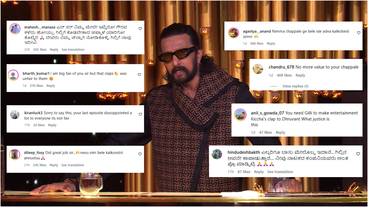 ‘ಈ ರೀತಿ ಹೇಳುತ್ತಿರುವುದಕ್ಕೆ ಕ್ಷಮೆ ಇರಲಿ.. ಕಳೆದ ಸಂಚಿಕೆ ನಿರಾಸೆ ಮೂಡಿಸಿತು’, ‘ಗಿಲ್ಲಿಗೆ ಕೊಡಬೇಕಾದ ಚಪ್ಪಾಳೆಯನ್ನು ಯಾರಿಗೋ ಕೊಟ್ಟಿದ್ದೀರಿ’, ‘ಗಿಲ್ಲಿಗೆ ನಿಮ್ಮ ಚಪ್ಪಾಳೆ ಸಿಗದೇ ಇದ್ದರೆ ಏನಂತೆ, ಇಡೀ ಕರ್ನಾಟಕದ ಜನತೆಯ ಚಪ್ಪಾಳೆ ಅವರಿಗೆ ಸಿಕ್ಕಿದೆ’ ಎಂಬಿತ್ಯಾದಿ ಕಮೆಂಟ್ಗಳು ಕೂಡ ಬಂದಿವೆ. ಇವುಗಳಿಗೆ ಸುದೀಪ್ ಅವರು ಪ್ರತಿಕ್ರಿಯೆ ನೀಡುತ್ತಾರಾ ಎಂಬುದನ್ನು ಕಾದು ನೋಡಬೇಕು.