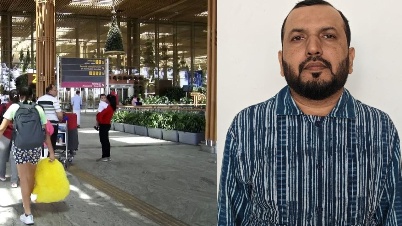 ಕೆಂಪೇಗೌಡ ಅಂತಾರಾಷ್ಟ್ರೀಯ ವಿಮಾನ ನಿಲ್ದಾಣ ಹಾಗೂ ಬಂಧಿತ ಆರೋಪಿ ಅಬು ಅಕಿಲ್ ಅಜರ್ ಚಾದ್Image Credit source: tv9
