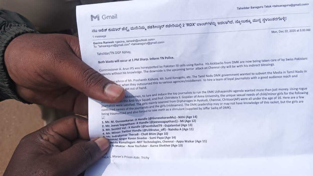 ಮೈಸೂರು, ಡಿಸೆಂಬರ್ 22: ಇತ್ತೀಚಿಗೆ ಮಂಗಳೂರು, ಭಟ್ಕಳ ಸೇರಿದಂತೆ ರಾಜ್ಯದಲ್ಲಿ ಹುಸಿ ಬಾಂಬ್ ಬೆದರಿಕೆ (Bomb Threat) ಇ-ಮೇಲ್ಗಳು ಹೆಚ್ಚಿದ್ದು, ಇದೀಗ ಸಿಎಂ ಮೈಸೂರು ಭೇಟಿಯ ನಡುವೆಯೇ ಸರಗೂರು ತಾಲೂಕು ಕಚೇರಿಗೂ ಇದೇ ರೀತಿಯ ಇ-ಮೇಲ್ ಬಂದಿರುವುದು ಆತಂಕ ಸೃಷ್ಟಿಸಿದೆ. ಮಾಹಿತಿ ತಿಳಿದ ಪೊಲೀಸರು ಸ್ಥಳಕ್ಕೆ ಭೇಟಿ ನೀಡಿದ್ದು, ಪರಿಶೀಲನೆ ನಡೆಸಿದ್ದಾರೆ.