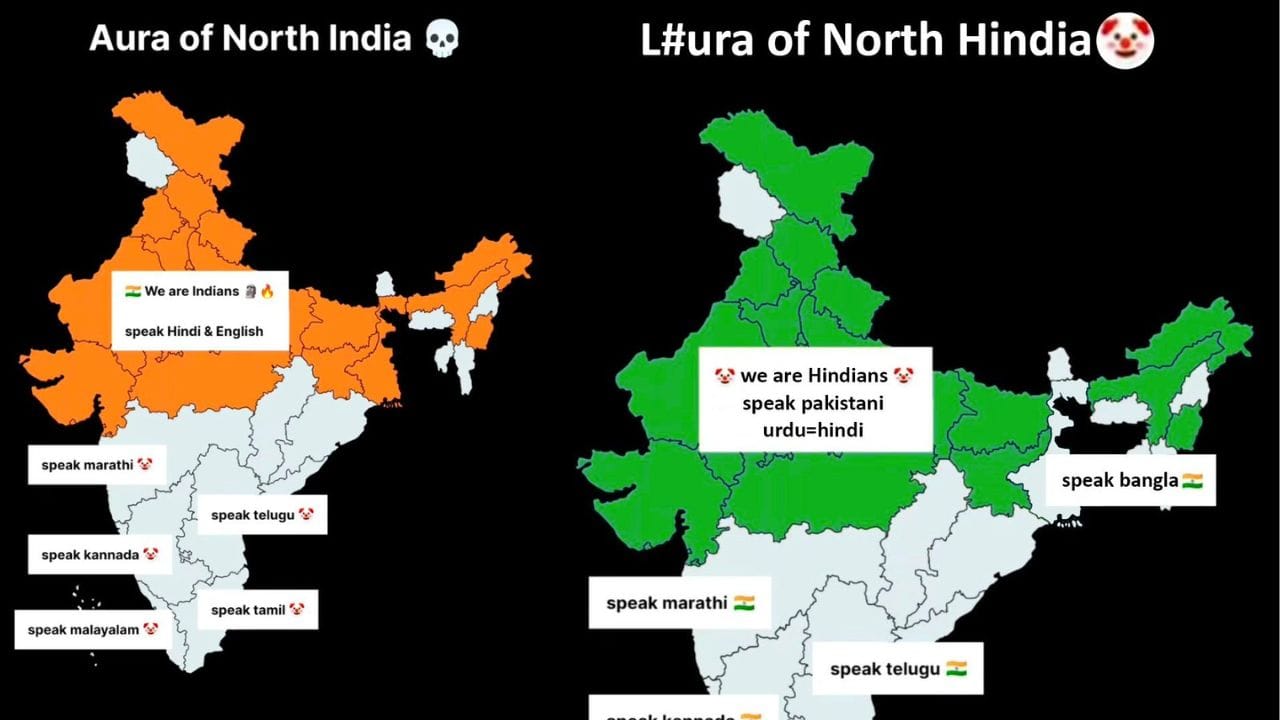 ಸಾಮಾಜಿಕ ಜಾಲತಾಣದಲ್ಲಿ ಭಾಷಾವಾರು (India language) ಗಲಾಟೆ ನಡೆಯತ್ತ ಇರುತ್ತದೆ. ಉತ್ತರ ಭಾರತ ಹಾಗೂ ದಕ್ಷಿಣ ಭಾರತದ ನಡುವೆ ಭಾಷೆಯ ವಿಷಯವಾಗಿ ಭಾರೀ ಜಗಳಗಳು ನಡೆದಿದೆ. ಬೆಂಗಳೂರಿನಲ್ಲೂ ಕೂಡ ಹಿಂದಿ ಏರಿಕೆ ಆಗುತ್ತಿದೆ ಎಂಬ ಕೂಗು ಕೂಡ ಕೇಳಿ ಬರುತ್ತಿದೆ. ಇದರ ನಡುವೆ ಎಕ್ಸ್ನಲ್ಲಿ ಹಂಚಿಕೊಂಡಿರುವ ಈ ಪೋಸ್ಟ್ ಭಾರೀ ಚರ್ಚೆಗೆ ಕಾರಣವಾಗಿದೆ. ಇದೀಗ ಇದು ದಕ್ಷಿಣ ಹಾಗೂ ಉತ್ತರ ಭಾರತ ನಡುವಿನ ಭಾಷೆ ವಿಚಾರವಾಗಿ ಹೊಸ ವಿವಾದವನ್ನು ಹುಟ್ಟು ಹಾಕಿದೆ. ಈ ಪೋಸ್ಟ್ ಸಾಮಾಜಿಕ ಜಾಲತಾಣಗಳಲ್ಲಿ ನಡೆಯುತ್ತಿರುವ ‘ಉತ್ತರ ಭಾರತ ಮತ್ತು ದಕ್ಷಿಣ ಭಾರತ’ ನಡುವಿನ ಭಾಷಾ ಸಂಘರ್ಷ ಅಥವಾ ವಿವಾದದ ಒಂದು ಮುಖವನ್ನು ತೋರಿಸುತ್ತಿದೆ. ಈ ಮೀಮ್ (meme) ಮೂಲಕ ಉತ್ತರ ಭಾರತೀಯರು ತಮ್ಮನ್ನು ತಾವು ಕೇವಲ ಭಾರತೀಯರು ಎಂದು ಗುರುತಿಸಿಕೊಳ್ಳುತ್ತಾರೆ ಮತ್ತು ಹಿಂದಿ-ಇಂಗ್ಲಿಷ್ ಬಳಸುತ್ತಾರೆ ಎಂಬ ಹೆಮ್ಮೆಯನ್ನು ವ್ಯಕ್ತಪಡಿಸಲು ಪ್ರಯತ್ನಿಸಿದ್ದಾರೆ.