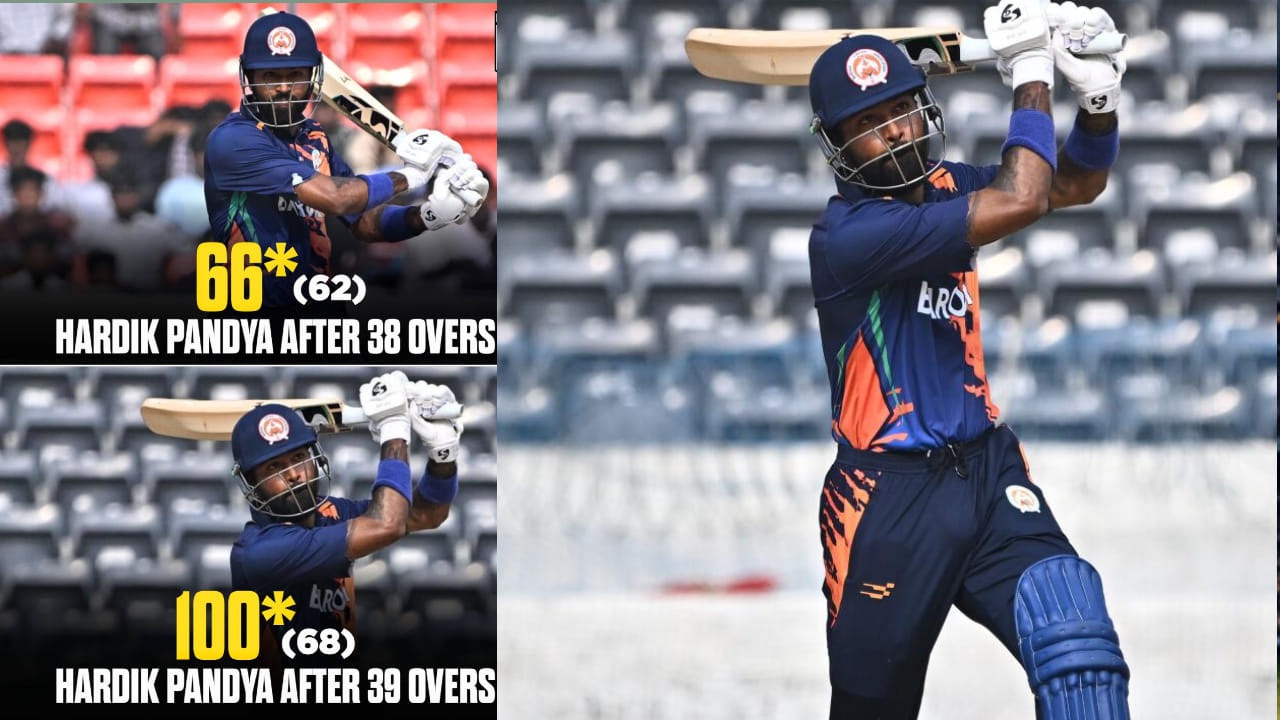 2025-26 ರ ವಿಜಯ್ ಹಜಾರೆ ಟ್ರೋಫಿಯಲ್ಲಿ ಬರೋಡಾ ಮತ್ತು ವಿದರ್ಭ ಪರಸ್ಪರ ಮುಖಾಮುಖಿಯಾಗಿದ್ದವು. ಈ ಪಂದ್ಯದಲ್ಲಿ ಬರೋಡಾ ತಂಡ ಸೋತಿತ್ತಾದರೂ ತಂಡದ ಪರ ಹಾರ್ದಿಕ್ ಪಾಂಡ್ಯ ಸಿಡಿಲಬ್ಬರದ ಬ್ಯಾಟಿಂಗ್ ಪ್ರದರ್ಶಿಸಿದರು. ಟಾಸ್ ಸೋತು ಮೊದಲು ಬ್ಯಾಟಿಂಗ್ ಮಾಡಿದ ಬರೋಡಾ 71 ರನ್ಗಳಿಗೆ ಪ್ರಮುಖ 5 ವಿಕೆಟ್ಗಳನ್ನು ಕಳೆದುಕೊಂಡಿತ್ತು. ಈ ವೇಳೆ ಕಣಕ್ಕಿಳಿದ ಹಾರ್ದಿಕ್ ತಮ್ಮ ಸಹೋದರ ಕೃನಾಲ್ ಪಾಂಡ್ಯ ಅವರೊಂದಿಗೆ ಆರನೇ ವಿಕೆಟ್ಗೆ 65 ರನ್ಗಳ ಪಾಲುದಾರಿಕೆಯನ್ನು ಹಂಚಿಕೊಂಡರು.