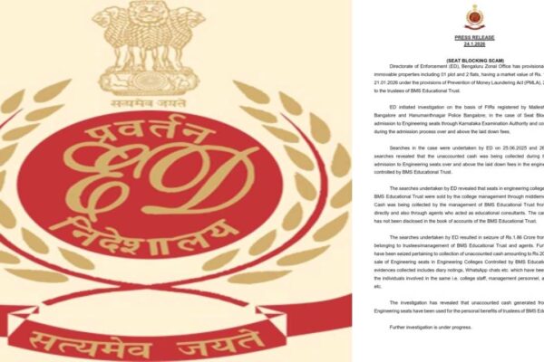 ಎಂಜಿನಿಯರಿಂಗ್ ಸೀಟ್ ಬ್ಲಾಕ್, PSI ನೇಮಕಾತಿ ಹಗರಣದಲ್ಲಿ ಇಡಿ ಶಾಕ್! ಬೆಂಗಳೂರು, ಜನವರಿ 25: ಬೆಂಗಳೂರಿನ ಖ್ಯಾತ ಬಿಎಂಎಸ್ ಎಜುಕೇಶನ್ ಟ್ರಸ್ಟ್‌ಗೆ ಸಂಬಂಧಿಸಿದ ಎಂಜಿನಿಯರಿಂಗ್ ಸೀಟ್ ಬ್ಲಾಕಿಂಗ್ (Seat Blocking) ಹಗರಣ ಪ್ರಕರಣದಲ್ಲಿ ಜಾರಿ ನಿರ್ದೇಶನಾಲಯ (ED) ಮಹತ್ವದ ಕ್ರಮ ಕೈಗೊಂಡಿದ್ದು, 19.46 ಕೋಟಿ ರೂ. ಮೌಲ್ಯದ ಆಸ್ತಿಯನ್ನು ಮುಟ್ಟುಗೋಲು ಹಾಕಿಕೊಂಡಿದೆ. ಅದಲ್ಲದೆ ರಾಜ್ಯದಲ್ಲಿ 2021–22ರಲ್ಲಿ ನಡೆದ 545 ಪಿಎಸ್‌ಐಗಳ (PSI) ನೇಮಕಾತಿ ಅಕ್ರಮ ಪ್ರಕರಣಕ್ಕೆ ಸಂಬಂಧಿಸಿದಂತೆಯೂ ಇಡಿ 1.53 ಕೋಟಿ ರೂ. ಮೌಲ್ಯದ ಆಸ್ತಿಯನ್ನು ಮುಟ್ಟುಗೋಲು…
